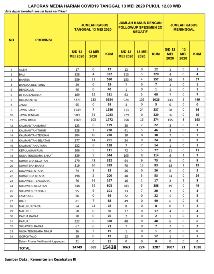 Update Kasus Covid 19 Di Indonesia 13 Mei 2020 15 438 Pasien