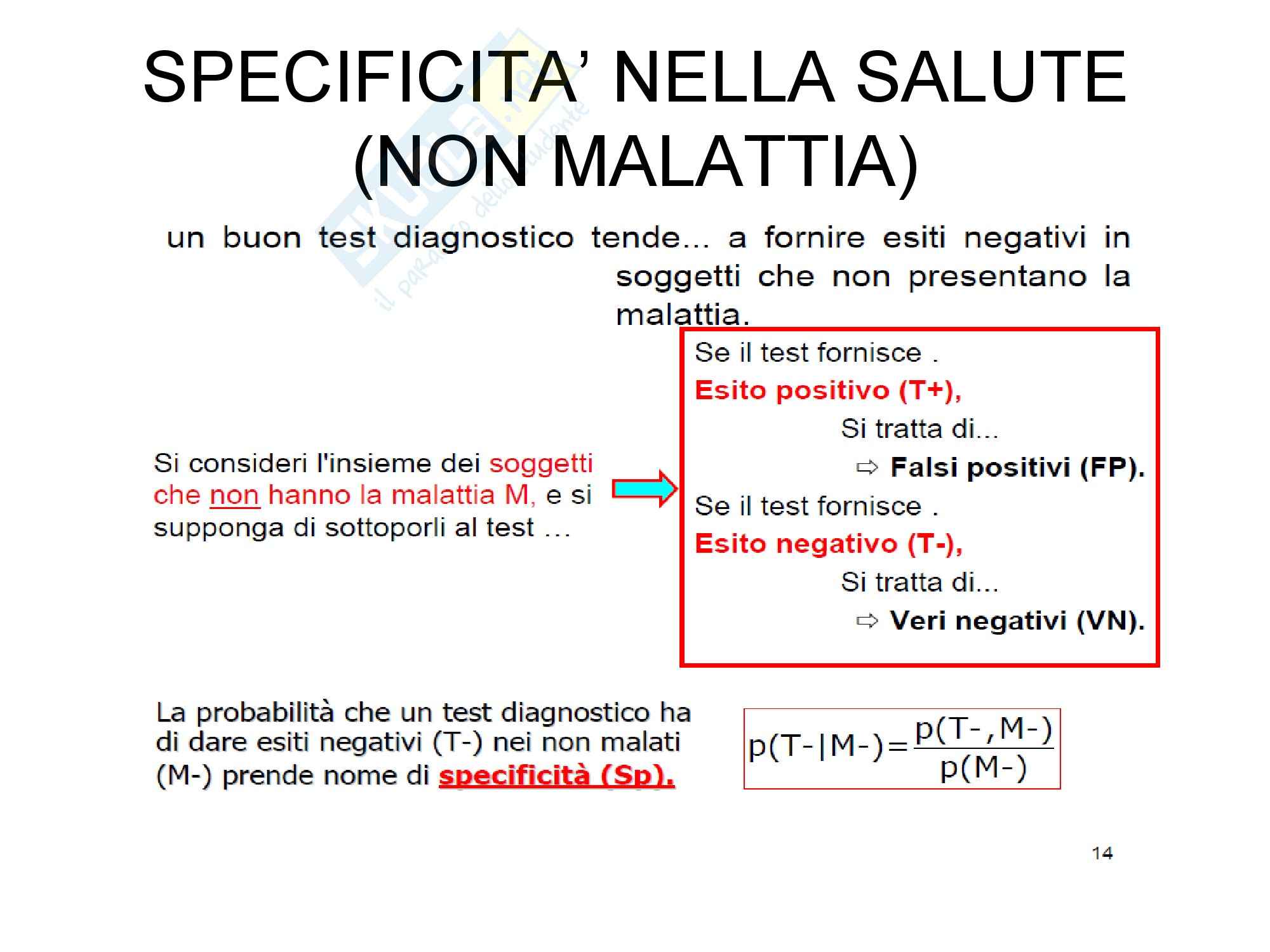 Specificità e sensibilità Tale concetto si contrappone a quello di specificità cioè la capacità del test di individuare come negativi i soggetti sani.